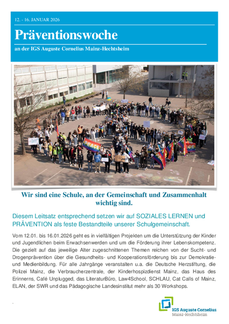 Am 07.04.25 waren die Ministerin für Bildung Dr. Stefanie Hubig der Minister für Wissenschaft und Gesundheit Clemens Hoch und zahlreiche Vertreter unterschiedlicher Verbände zu Gast an der IGS Auguste Cornelius Mainz-Hechtsheim. Anlass dafür war die Verlängerung des Präventionsprojekts "Verrückt? Na und! Psychisch fit in der Schule" und die Unterzeichnung der Kooperationsvereinbarung hierzu. Das Land fördert das Projekt vorerst bis 2028.