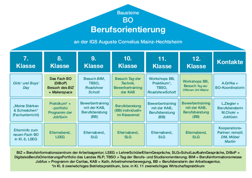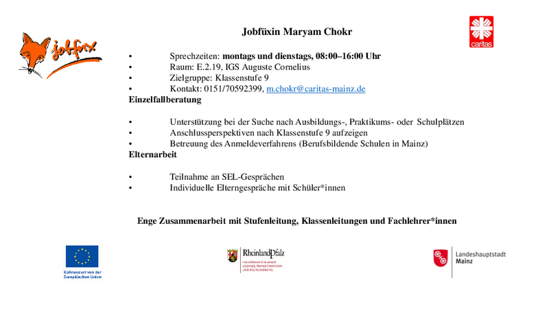 Unsere Jobfüxin ist Maryam Chokr. Sie ist sozialpädagogische Mitarbeiterin der Trägerschaft des Caritasverbandes Mainz. Sie ist Ansprechpartnerin für die Schülerinnen und Schüler der 8. und 9. Jahrgangsstufen mit dem Abschlussziel Berufsreife, deren Eltern und Lehrkräfte. Frau Chokr unterstützt unsere Schülerinnen und Schüler bei der Suche nach Praktikums- und Ausbildungsplätzen, hilft beim Verfassen von Bewerbungen und der Anmeldung an weiterführenden Schulen nach der 9. Klasse. Weitere Infos zu dem Projekt und weitere Ansprechpartner hier.