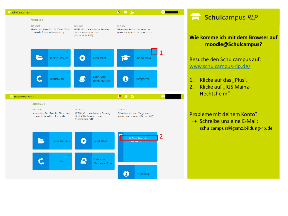 Sollten Sie mit Schulcampus Probleme haben, so können Sie sich über die E-mail Adresse schulcampus(at)igsmz.bildung-rp.de an uns wenden. Schauen Sie Sich auch die Antworten zu den häufigten Fragen an.